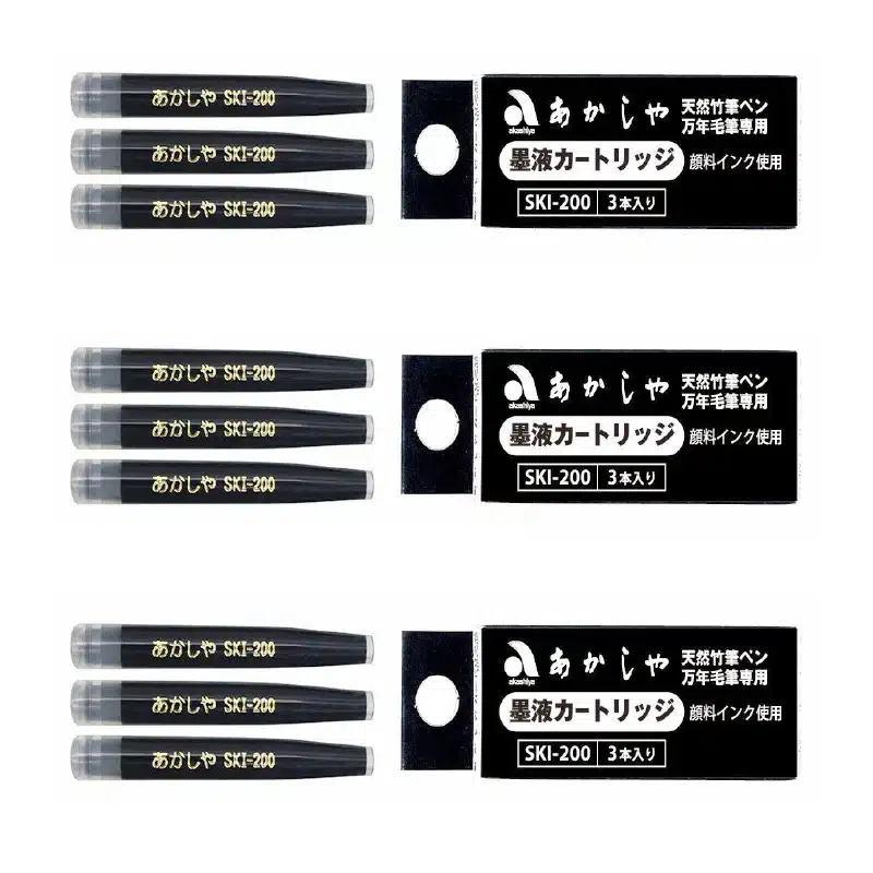 Cada pluma viene en una elegante caja de madera de paulownia e incluye 8 cartuchos de tinta negra (también disponibles por separado como recargas). Son ideales para usar con papeles washi en dibujo, ilustración o caligrafía japonesa.