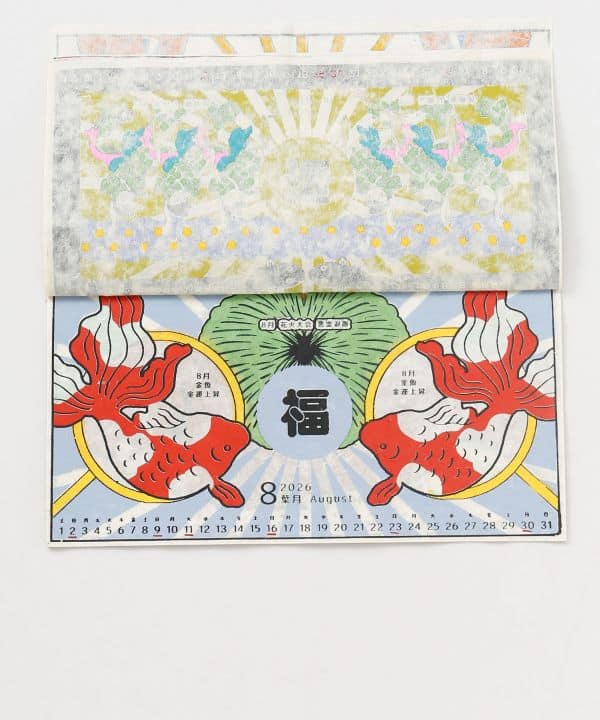 Calendario japonés 2026 con ilustraciones de símbolos de buena fortuna. Papel tipo washi. Un regalo alegre y auspicioso para el año nuevo.