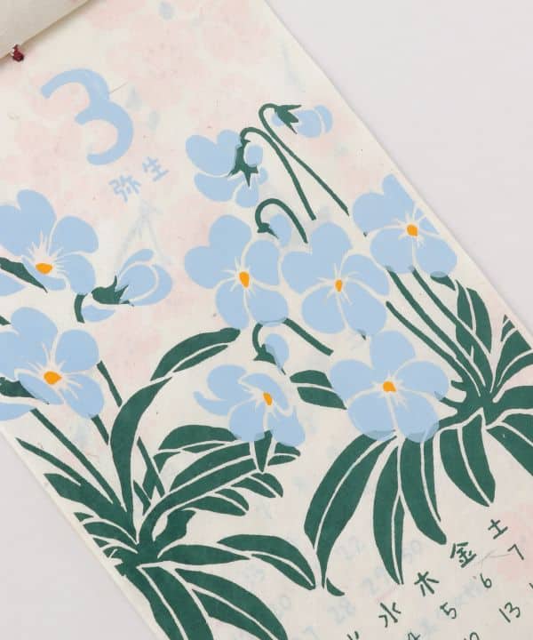Diseñado en formato vertical y de tamaño mediano, el calendario está impreso sobre papel tipo washi y mantiene el equilibrio entre lo funcional y lo decorativo. Las flores incluyen especies como el ciruelo (ume), el cerezo (sakura), el iris (ayame), el crisantemo (kiku) y más, todas con un estilo pictórico refinado y colorido.
