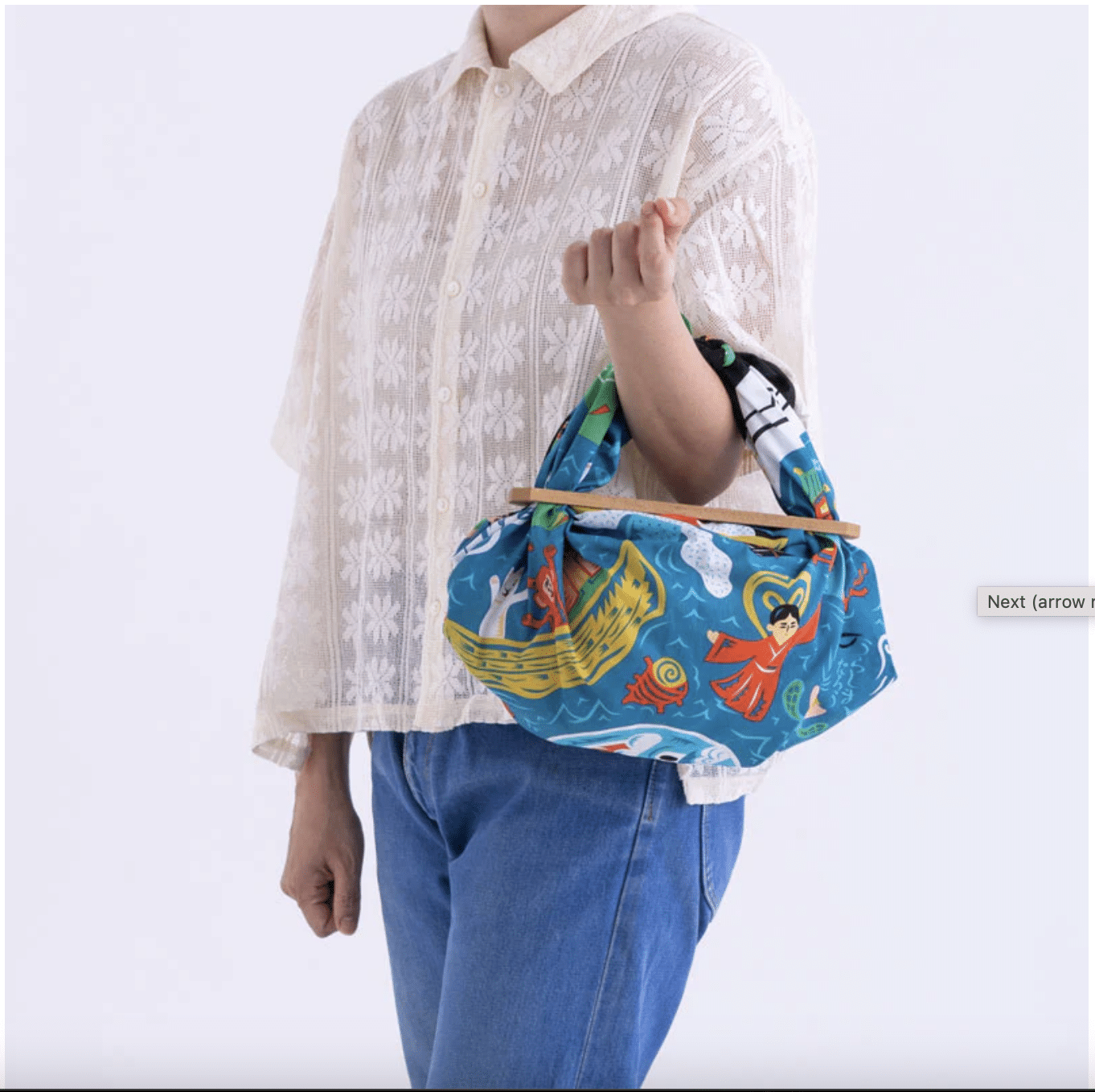 Este furoshiki de 70 cm forma parte de la colección de MUSUBI diseñada por el dúo gráfico japonés COCHAE, quienes reinterpretan los relatos tradicionales japoneses con una estética lúdica, contemporánea y cargada de referencias visuales.
