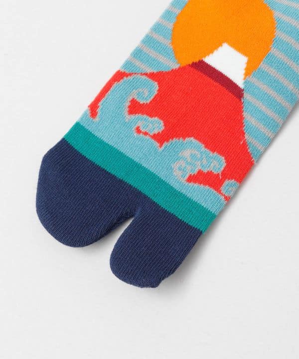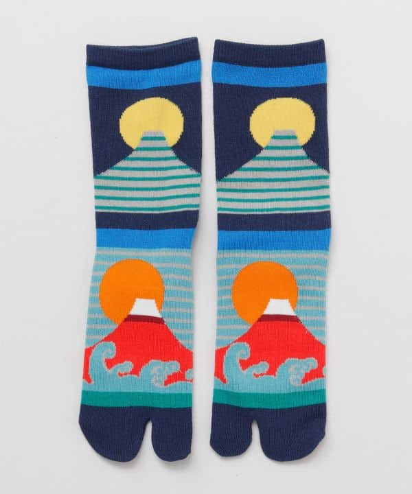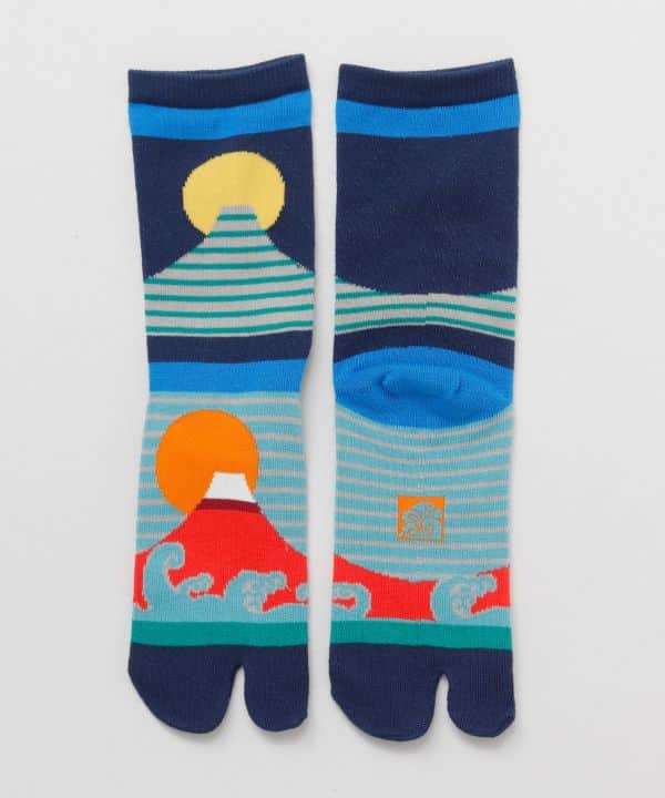 Estas medias tabi representan una versión estilizada del Monte Fuji rojo (Aka Fuji), rodeado de olas turquesas, franjas gráficas y un sol ascendente. El Aka Fuji es símbolo de buen augurio, renovación y energía positiva, y este diseño lo transmite con fuerza visual y equilibrio tradicional-moderno.