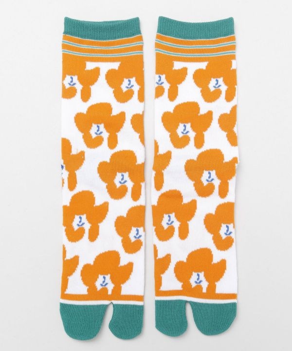 Estas medias tabi están decoradas con un simpático patrón de kokeshi – las tradicionales muñecas de madera japonesas – reinterpretadas en un estilo gráfico y colorido. El diseño en tonos naranjas vibrantes sobre fondo blanco, con detalles en verde, aporta un aire alegre, pop y nostálgico al mismo tiempo.