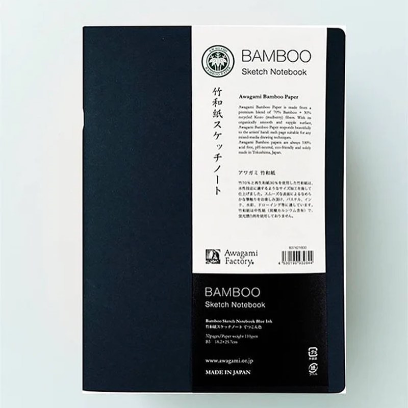 Un sketchbook de papel premium y eco-friendly de bambú, hecho a mano por Awagami Factory (Japón). Con la cubierta elaborada de papel “Shin Inbe” (cáñamo). Es de estilo minimalista, elaborado y cosido en Tokushima por artesanos y artistas japoneses, para artistas, diseñadores, arquitectos, y más que disfruten del papel y el arte.