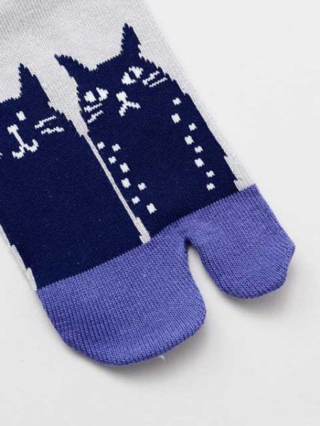 Calcetines tabi con diseño de gatitos en tono oscuro. Un toque divertido y tierno para celebrar y acompañarnos de los queridos gatitos, muy populares en Japón. Son artesanías fabricadas en Nara, perfectas para uso diario o como regalo exclusivo. Medidas: 23 a 25 cm
