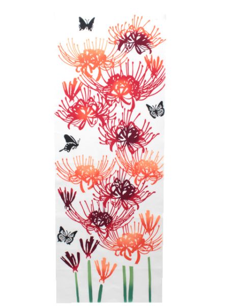 Tenugui japonés con diseño tradicional de flores higanbana, símbolo de despedidas y belleza efímera. Ideal para decoración, regalo o uso diario.